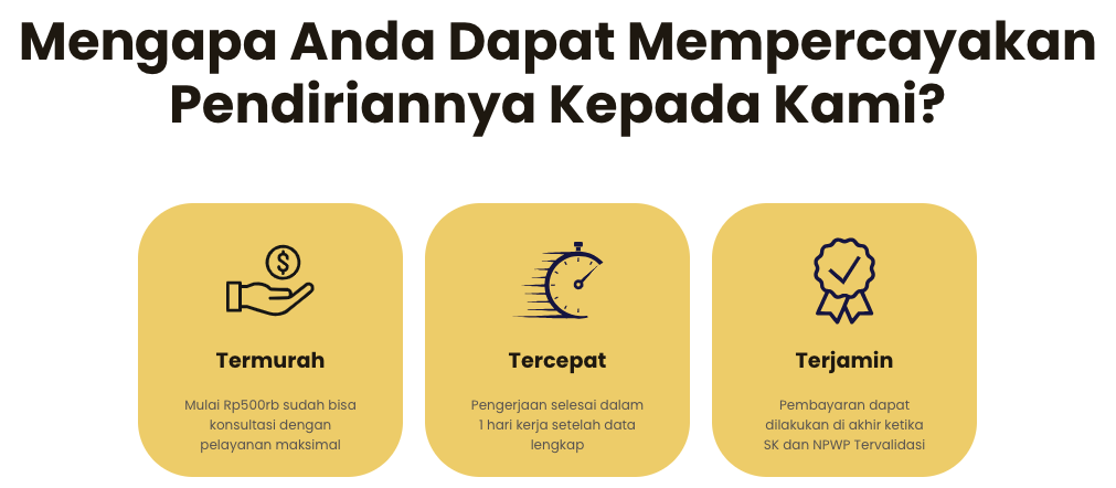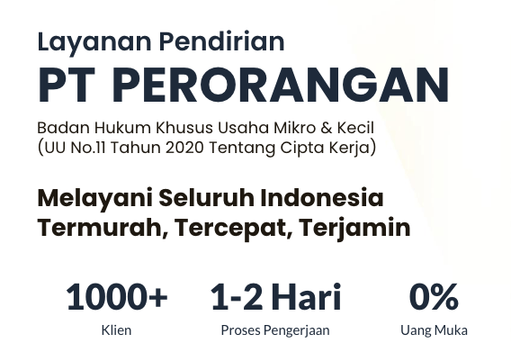 Untuk itu kami hadir melayani keperluan anda untuk membuat PT Perorangan dengan harga terjangkau dan kualitas layanan terbaik. Cek penawaran kami berikut: