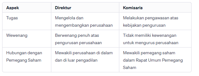 Perbedaan utama antara direktur dan komisaris terletak pada fungsi dan tanggung jawabnya. Direktur bertanggung jawab atas pengurusan perusahaan, sedangkan komisaris bertanggung jawab atas pengawasan perusahaan.